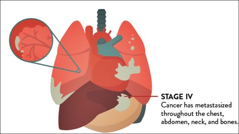 • In Stage III, the cancer has spread to lymph nodes in the center of the chest or to nearby areas.